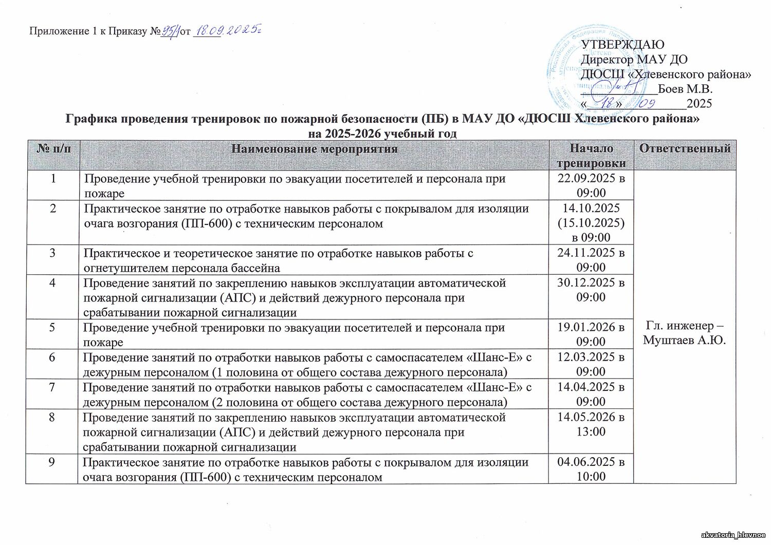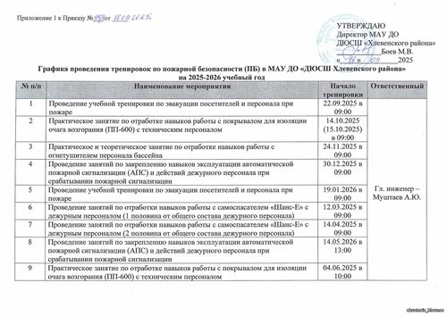 - Приказ "Об утверждении графика проведения тренировок по пожарной безопасности (ПБ) ... на 2025-2026 уч. год" №95/1 от 18.08.2025г;