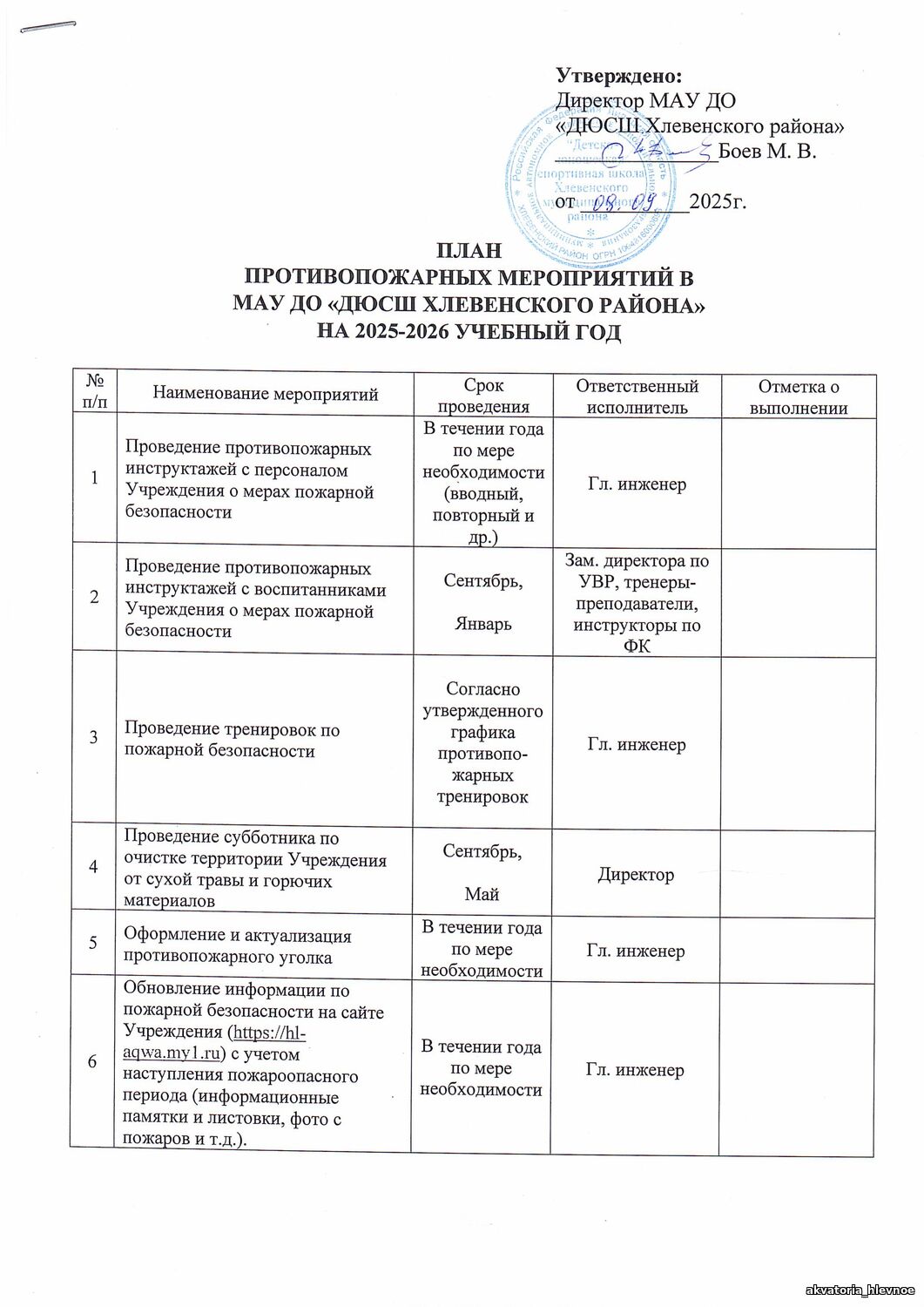 - Приказ "Об утверждении плана мероприятий по предупреждению гибели и травматизма детей на пожарах в МАУ ДО "ДЮСШ Хлевенского района" на 2025-2026гг" №75 от 09.06.2025 г.