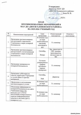- Приказ "Об утверждении плана противопожарных мероприятий на 2025-2026 уч. год" №93/1 от 08.09.2025г;
